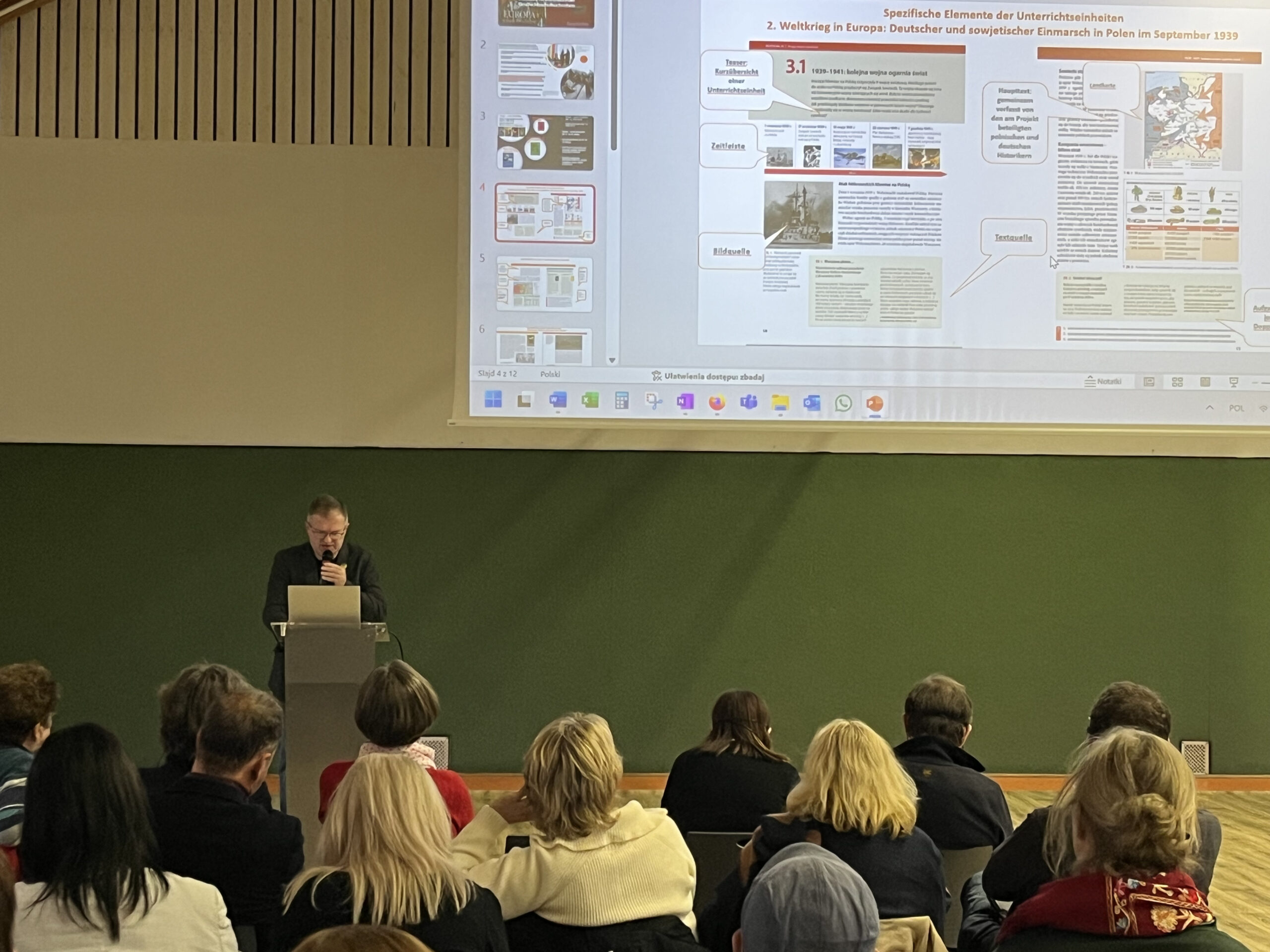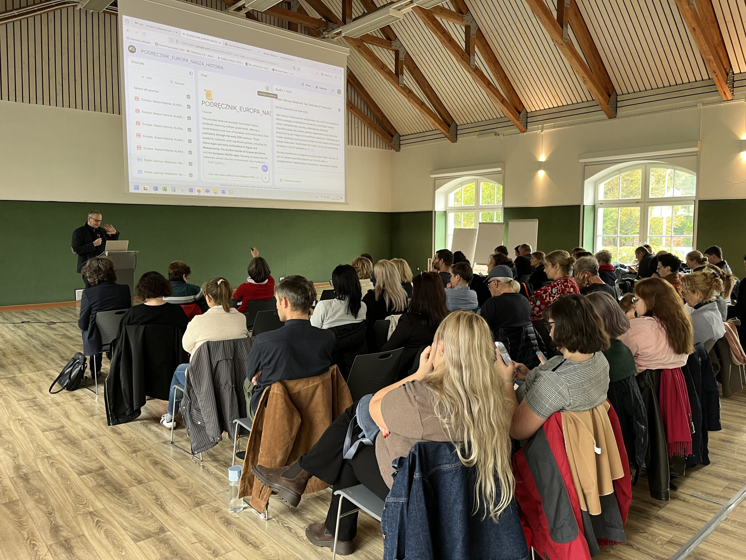 Am Samstagvormittag fand zunächst parallel zur Präsidiumssitzung, in der zukünftige Schwerpunkte der Kommissionsarbeit besprochen wurden, ein Lehrkräfte-Workshop statt, bei dem Erfahrungen bei der Arbeit mit dem bilateralen Geschichtsschulbuch »Europa – Unsere Geschichte | Europa. Nasza historia« ausgetauscht werden konnten. Nachmittags rückte für alle Teilnehmenden das Thema Digitalisierung in den Fokus: In gemeinsamen Workshops wurde zunächst unter Anleitung von Prof. Wiktor Werner (Universität Poznań/Posen) der Einsatz von KI in der historisch-politischen Bildung, insbesondere mit Blick auf mögliche digitale Weiterentwicklung der bilateralen Schulbuchreihe, dann loteten Dr. Dominik Pick, Prof. Igor Kąkolewski und Dr. Marcin Wiatr den Einsatz von KI am Beispiel des Kapitels „Widerstand in Europa 1939–1945“ aus Band 4 von »Europa – Unsere Geschichte | Europa. Nasza historia« aus, und brachten Möglichkeiten von digitalen Lösungen für Schüler*innen und Lehrkräfte im Geschichtsunterricht ins Gespräch. Die Ergebnisse der Beratungen des Präsidiums der Kommission sowie der beiden Workshops flossen in einen abschließenden Austausch am Sonntagvormittag ein. Hier wurde die Frage erörtert, inwieweit das Zeitalter digitaler Medien mit KI-Anwendungen eine Neubestimmung der Position der Kommissionsarbeit erfordert. So wurde angeregt, die Arbeit an digitalen Modulen für die Verflechtungsgeschichte Mittelosteuropas (insbesondere im deutsch-polnisch-ukrainischen Kontext) zu intensivieren und diese als Beitrag für die Schaffung einer virtuellen Lernumgebung für »Europa – Unsere Geschichte | Europa. Nasza historia« auszuflaggen. Als ebenso zielführend wurde eine neue, digital verfügbare Auswahl an relevanten Quellen für den Geschichtsunterricht beider Länder ins Gespräch gebracht. Bei der für 2027 geplanten Schulbuchtagung der Kommission sollen hingegen Aspekte historischer Grenzregionen in den Vordergrund rücken, die nach wie vor zu wenig beleuchtet würden und in Bildungsmedien, so auch bei musealen Ausstellungen, für kontroverse Debatten sorgen.